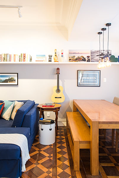 Para um casal cheio de livros, histórias e objetos trazidos de muitas viagens, nada como uma sala grande, confortável onde as recordações estejam à vista.